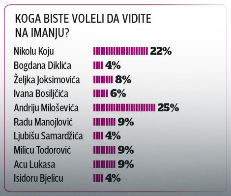 Anketa na sajtu Blic.rs, koju je za jedan dan posetilo više hiljada ljudi, izgleda ovako: prvo mesto sa 25 odsto glasova zauzeo je glumac Andrija Milošević, odmah ispod njega, sa 22 odsto, nalazi se Nikola Kojo, dok devet odsto imaju Rada Manojlović, Milica Todorović i Željko Joksimović.
