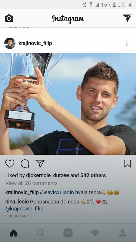 Cim je teniser Filip Krajinović (25) u Nemačkoj osvojio čelendžer i postavio fotografiju na Instagramu sa podignutim peharom u ruci, Nina Radulović (31) je na Instagram poslala komentar: „Ponosna do neba”!